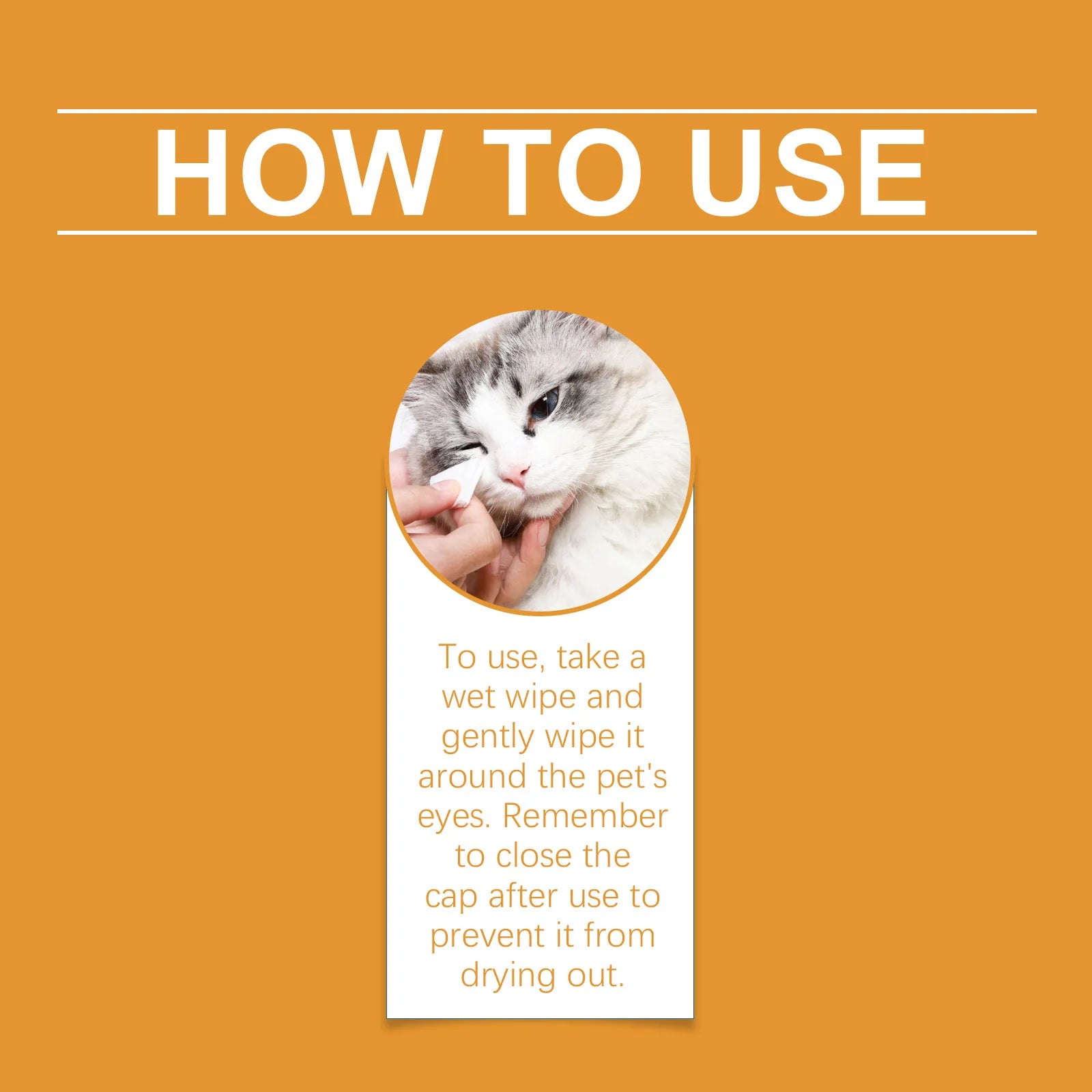Our cat and dog eye wipes contain witch hazel extract and glycerin. It can provide antioxidant protection and promote eye skin repair. Its usage is very simple: when using, take a wet wipe and gently wipe around the pet's eyes. After use, remember to close the lid to prevent it from drying out. And it can be designed specifically for the eyes of cats and dogs, safe and gentle.