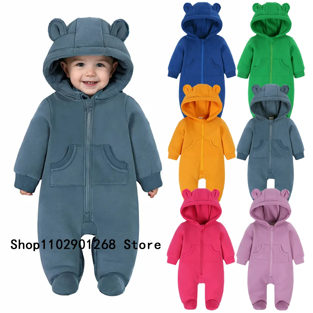 2024 Newborn Baby Winter Warm Romper Solid Pocket Hooded Bear Thick Clothes 0-24M Infant Boy Girl Outfits Bodysuit