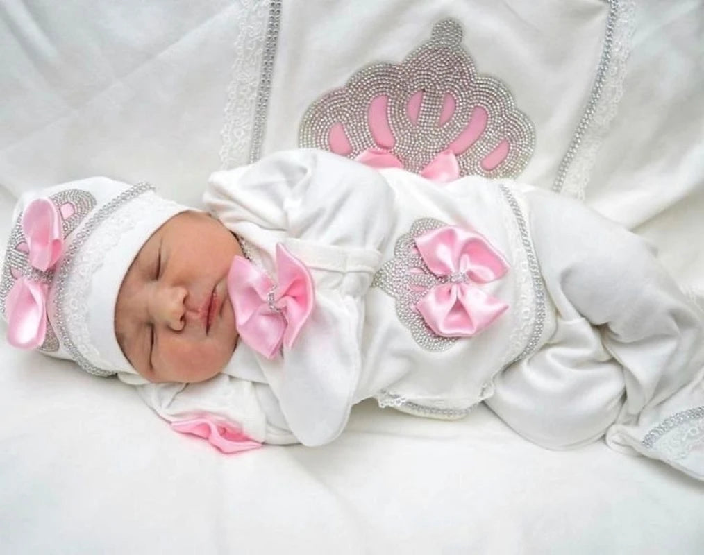 Our 5 pieces set is made up of soft, thick cotton. They are embellished with rhinestone buttons, crown jewels and bows.