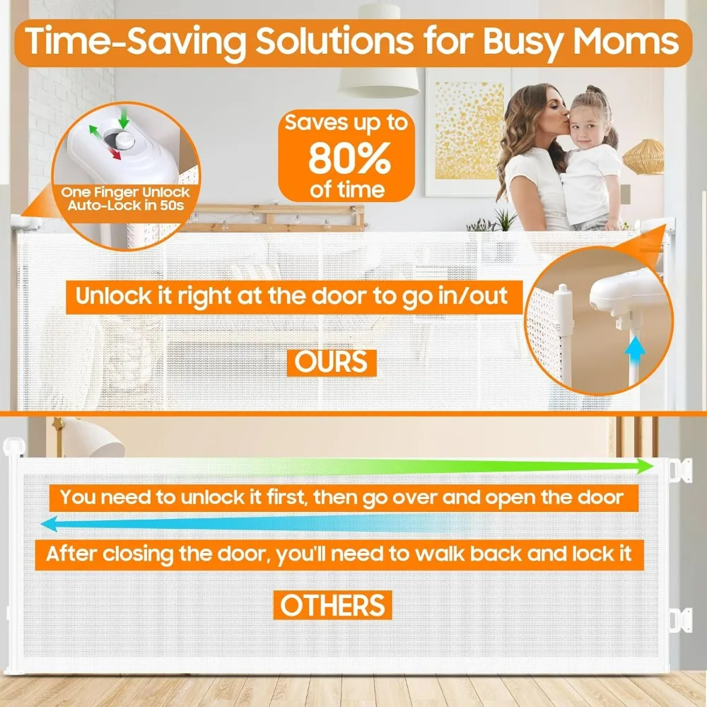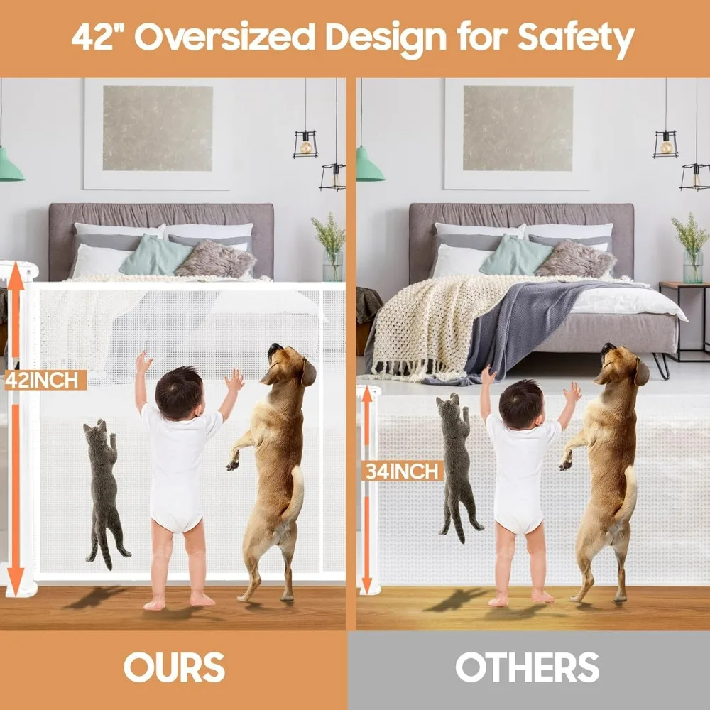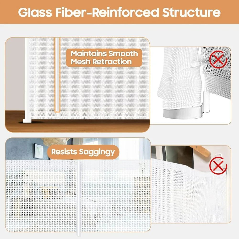 Extra Wide and Tall Retractable Baby and Dog Gate with Mesh and Support Rods for Child Safety