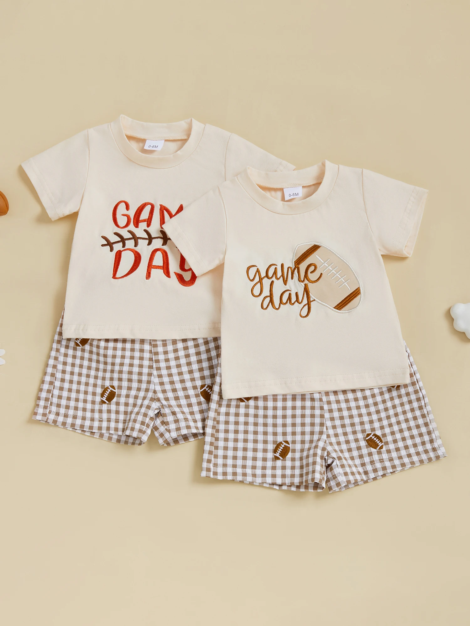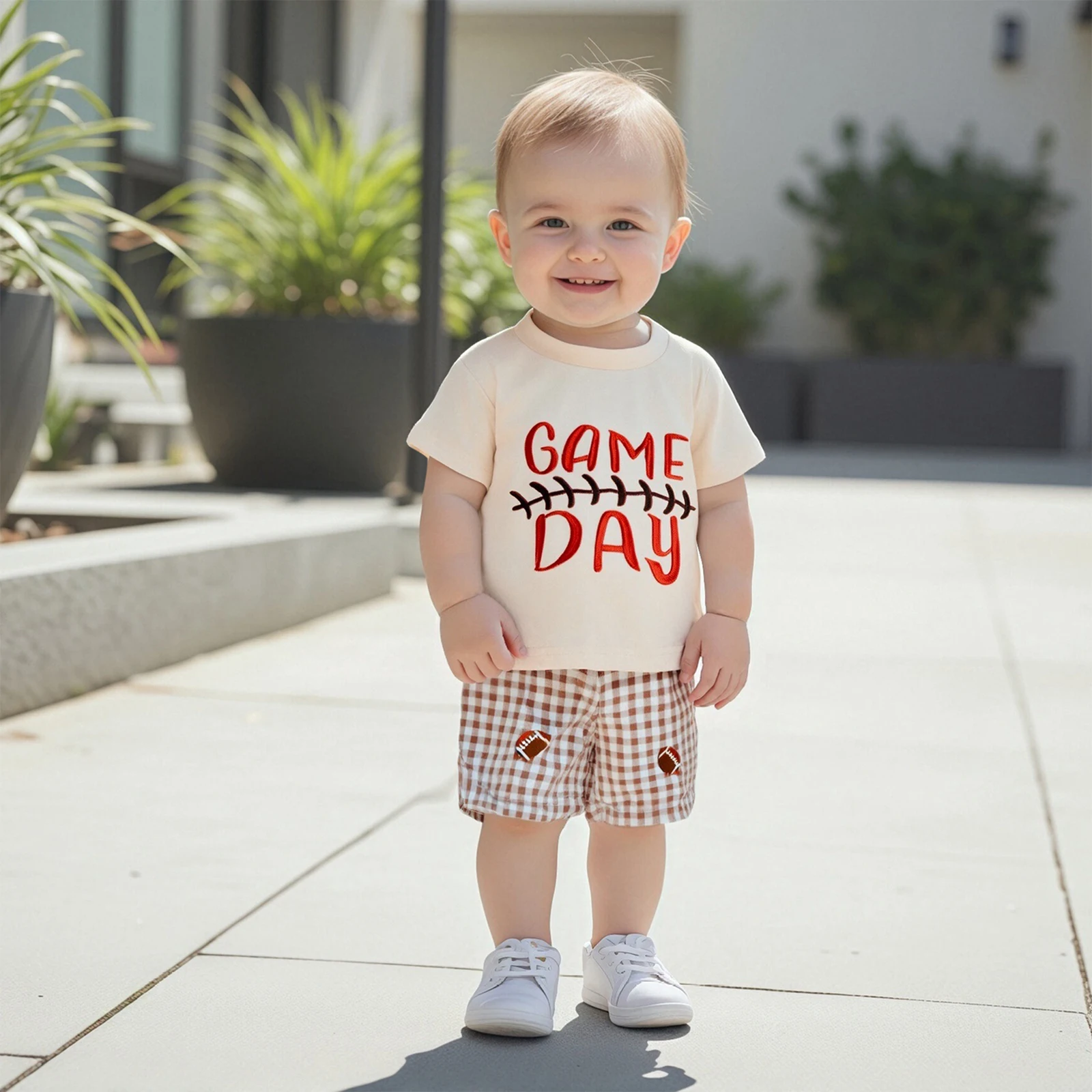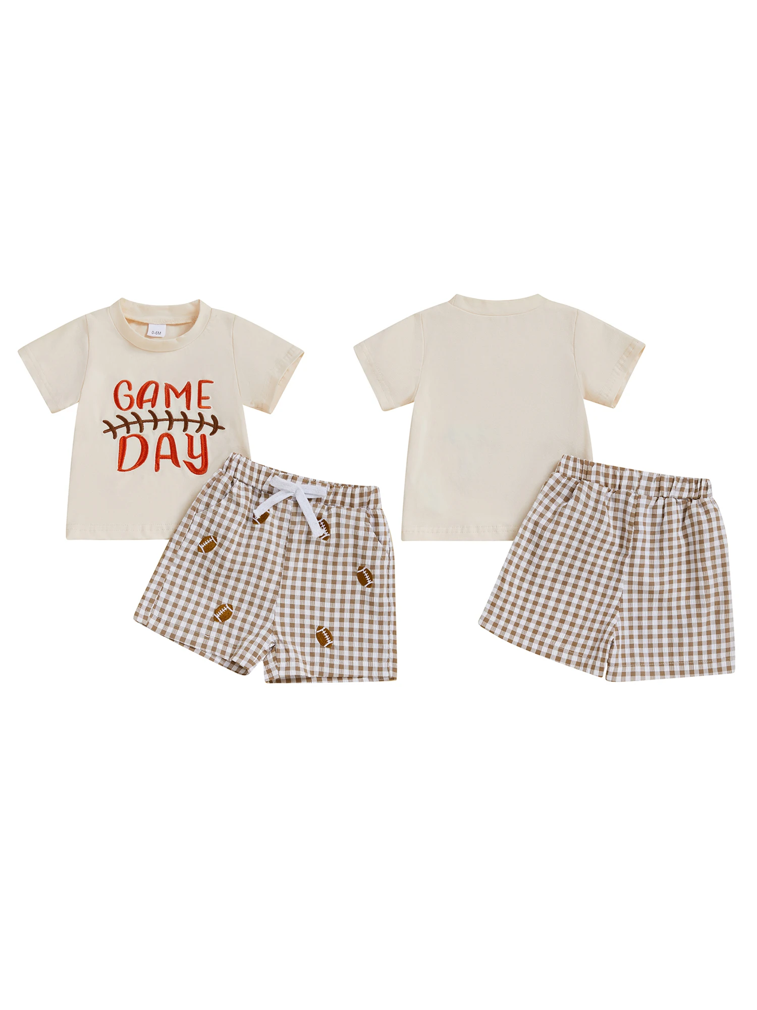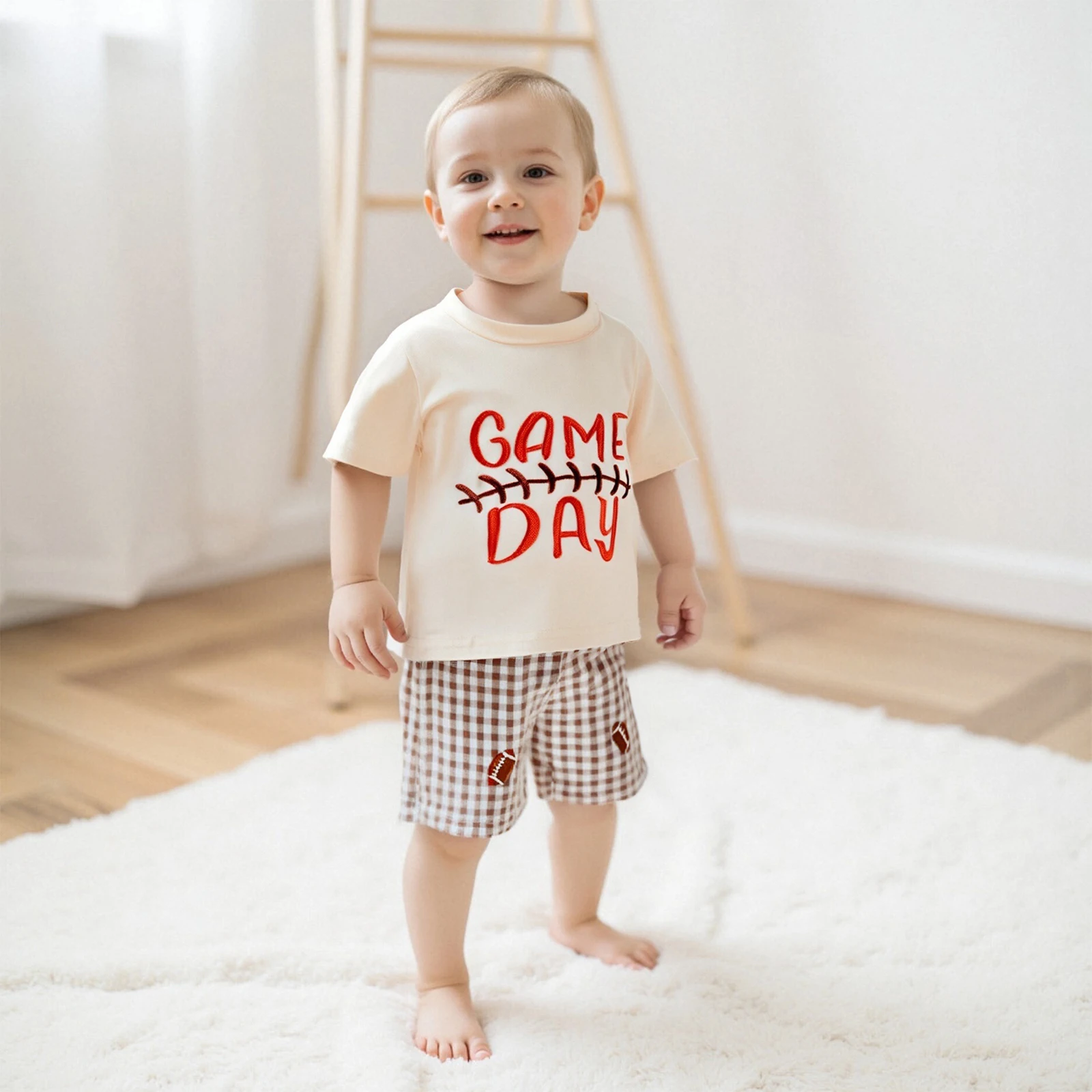 Toddler Baby Football Outfit Loose Fit Letter Print Crew Neck Short Sleeve T-Shirt with Plaid Shorts 2 Pcs Set for Summer