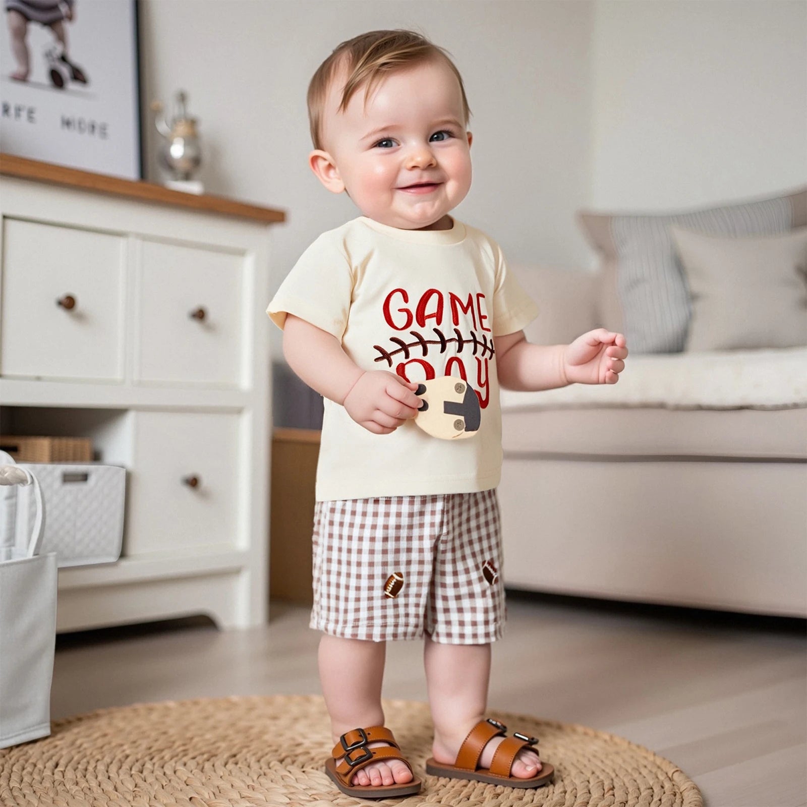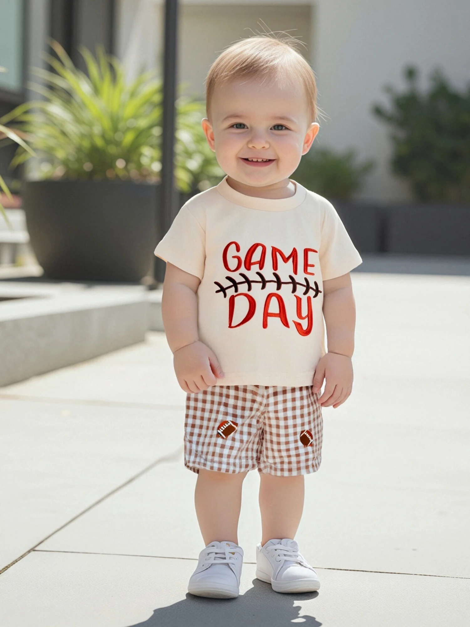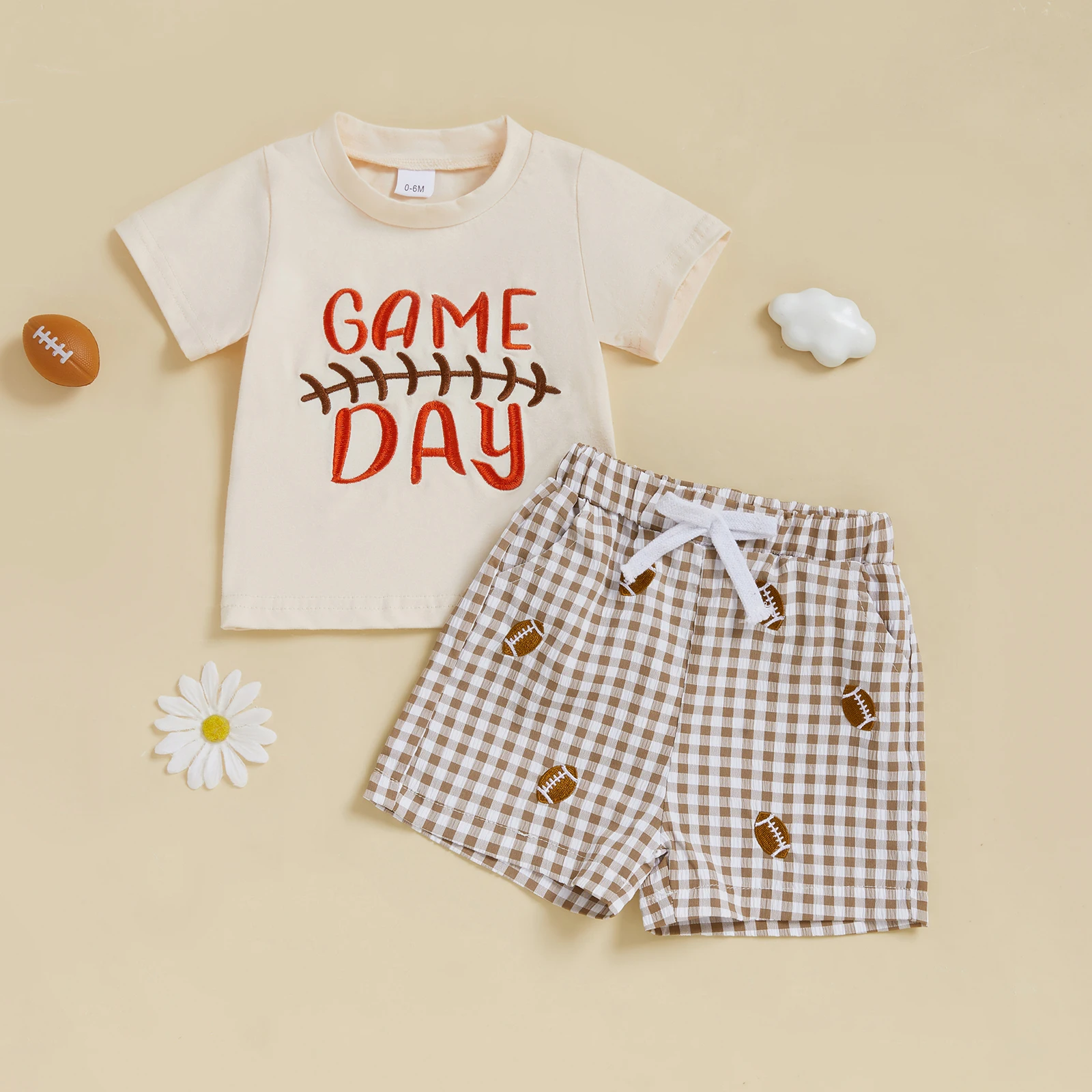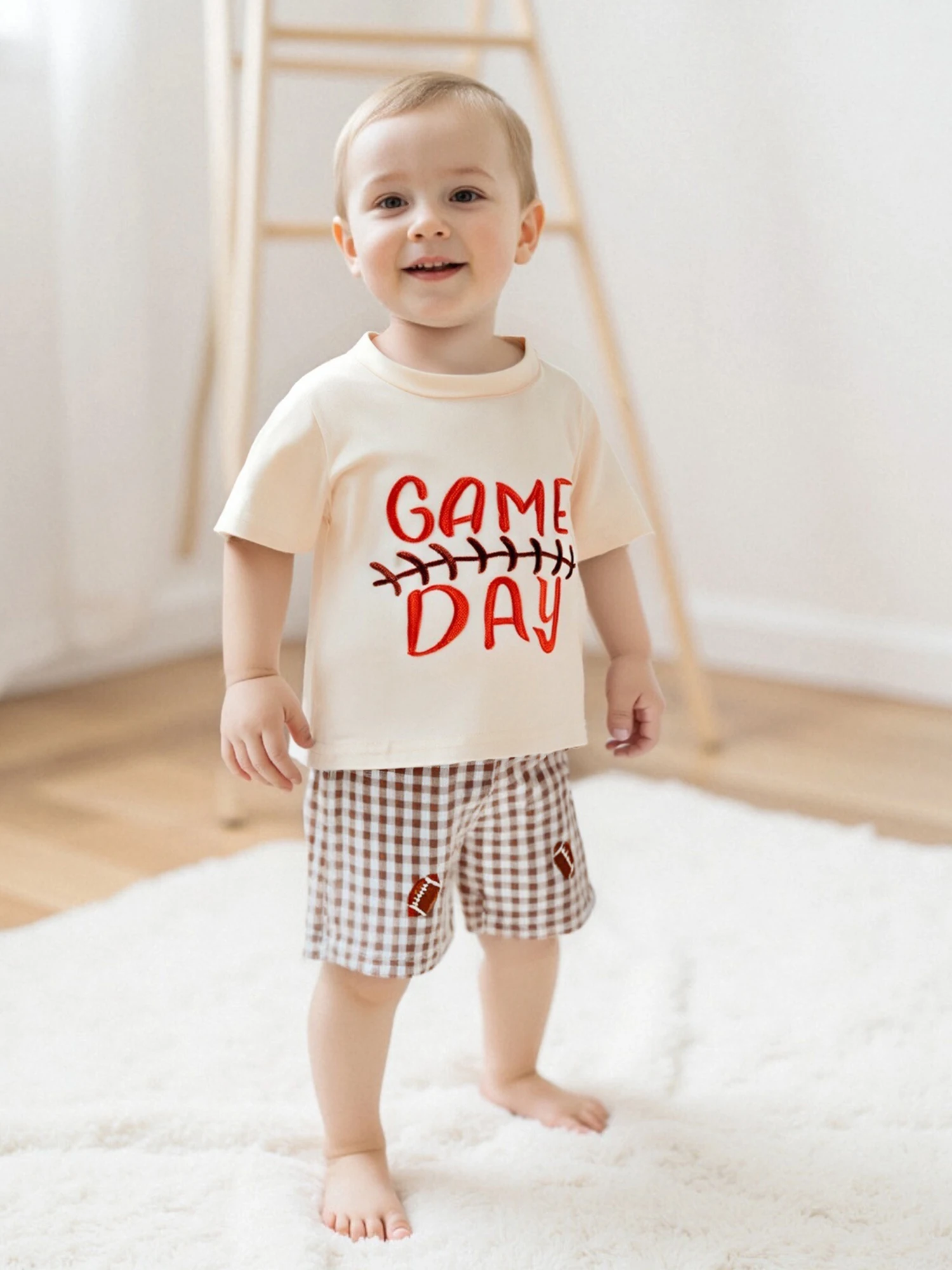 Toddler Baby Football Outfit Loose Fit Letter Print Crew Neck Short Sleeve T-Shirt with Plaid Shorts 2 Pcs Set for Summer