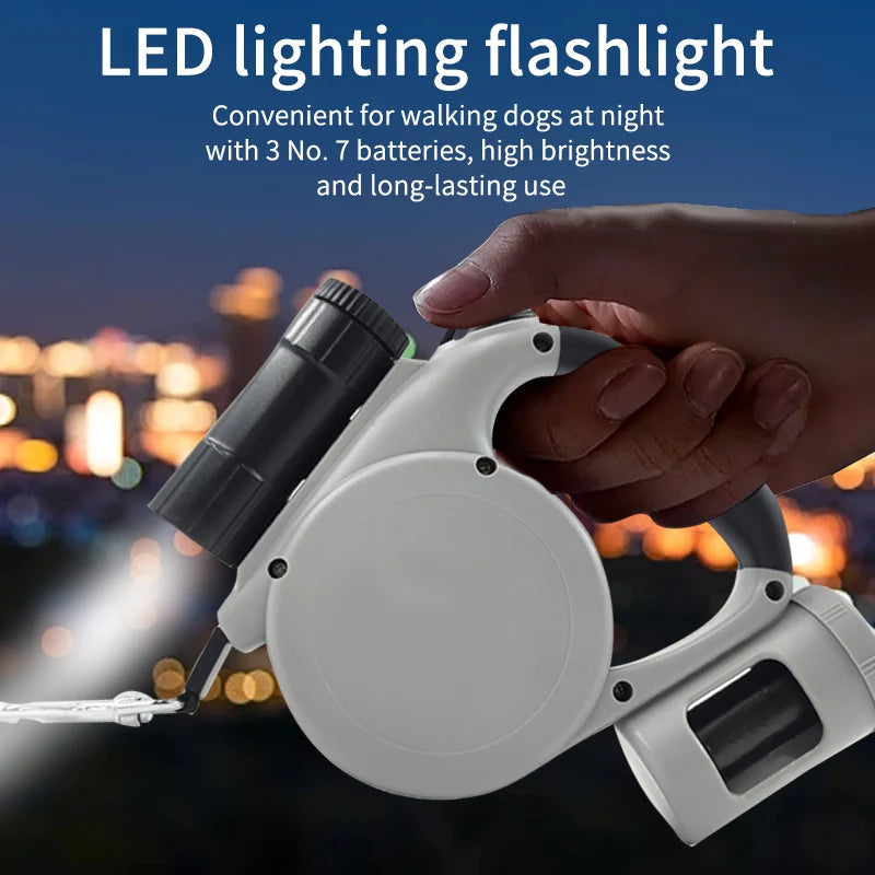 1. Multi-Function Design: Combines a retractable leash with an integrated waste bag holder and built-in flashlight, offering all-in-one convenience for walks.