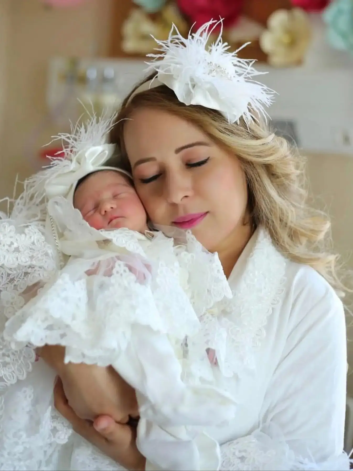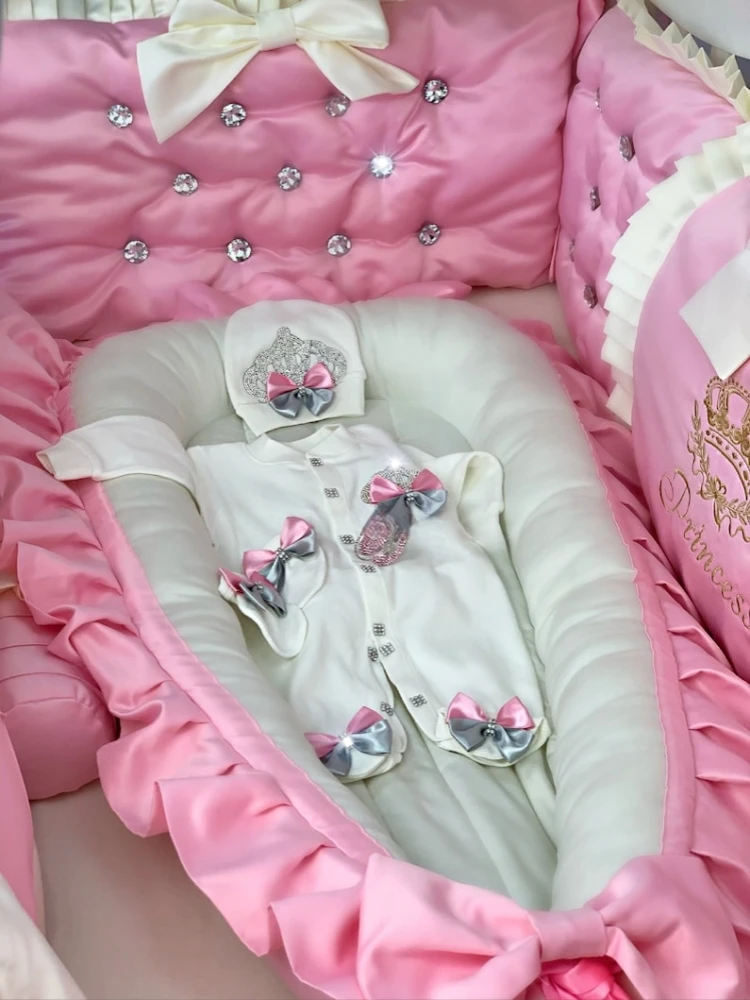 This luxury layette is made of softrich pink and white cotton.