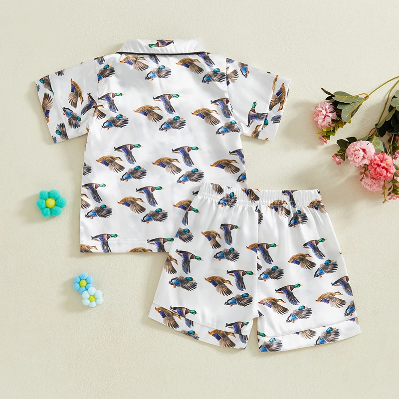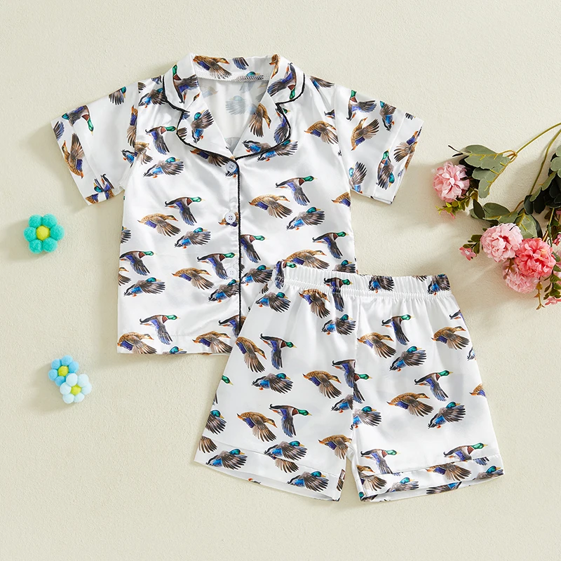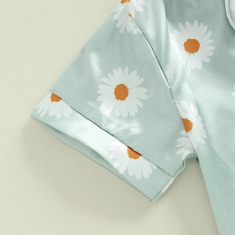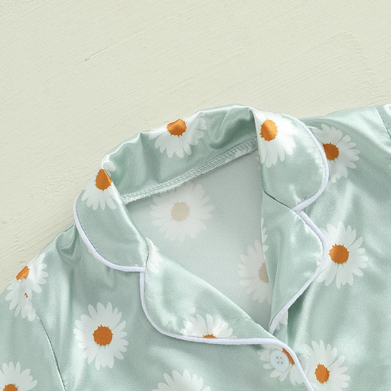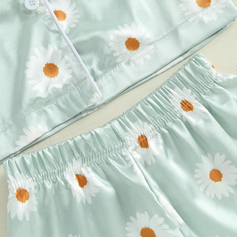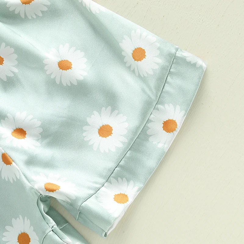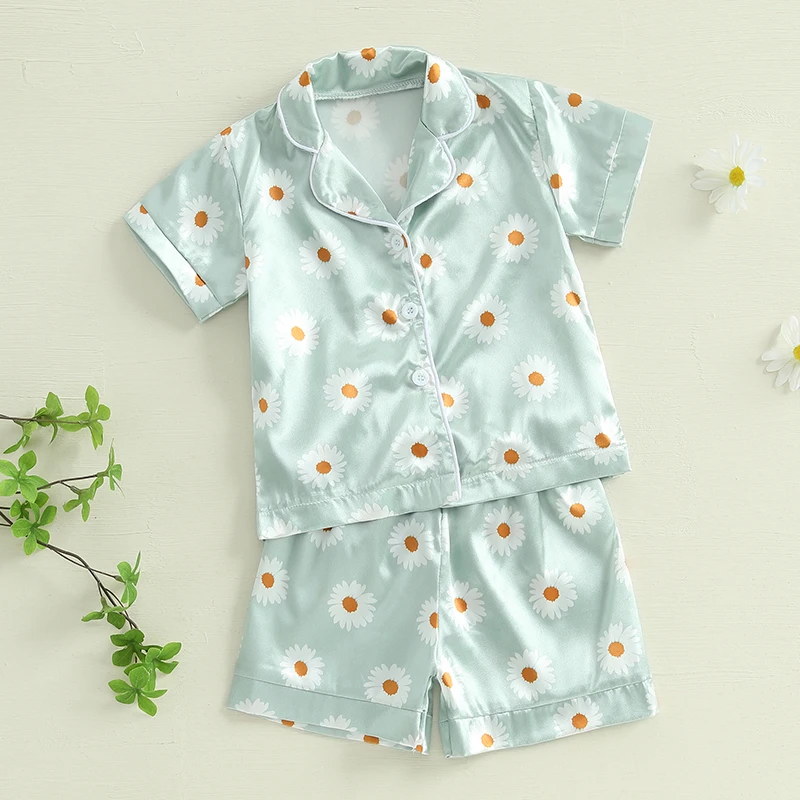 Boy Girl Summer Satin Pajamas Set Floral/Animal Print Short Sleeve Lapel Button Down Tops with Shorts Sleepwear